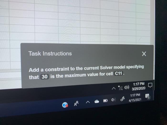 Task Instructions х Add a constraint to the current Solver model specifying that 30 is the maximum value for cell C11. Previous question Next question. A solver deals with numbers so youll need to quantify the various elements of your model -- the decision variables the objective and any constraints -- and their relationships.